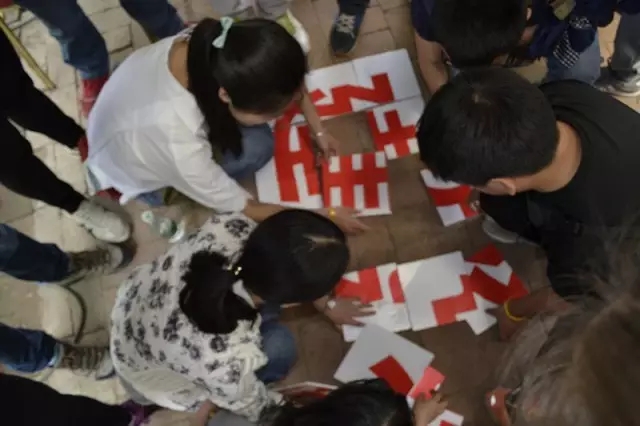 藏匿字塊的成員正將其中一塊藏進宣傳板